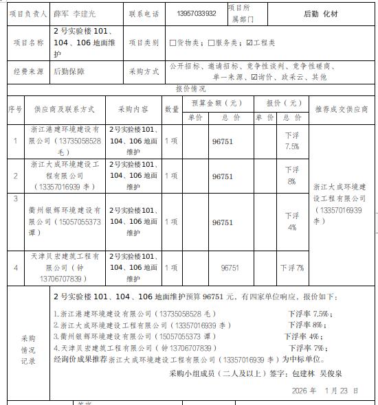 [分散采购]2号实验楼101、104、106地面维护采购项目公示