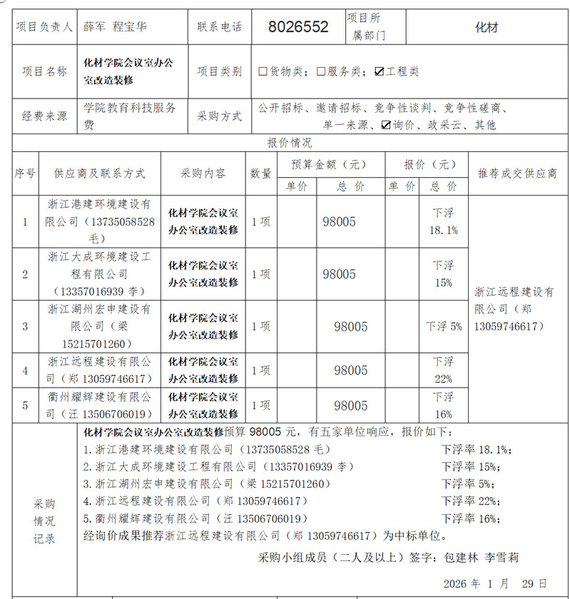 [分散采购]化材学院会议室办公室改造装修采购项目公示